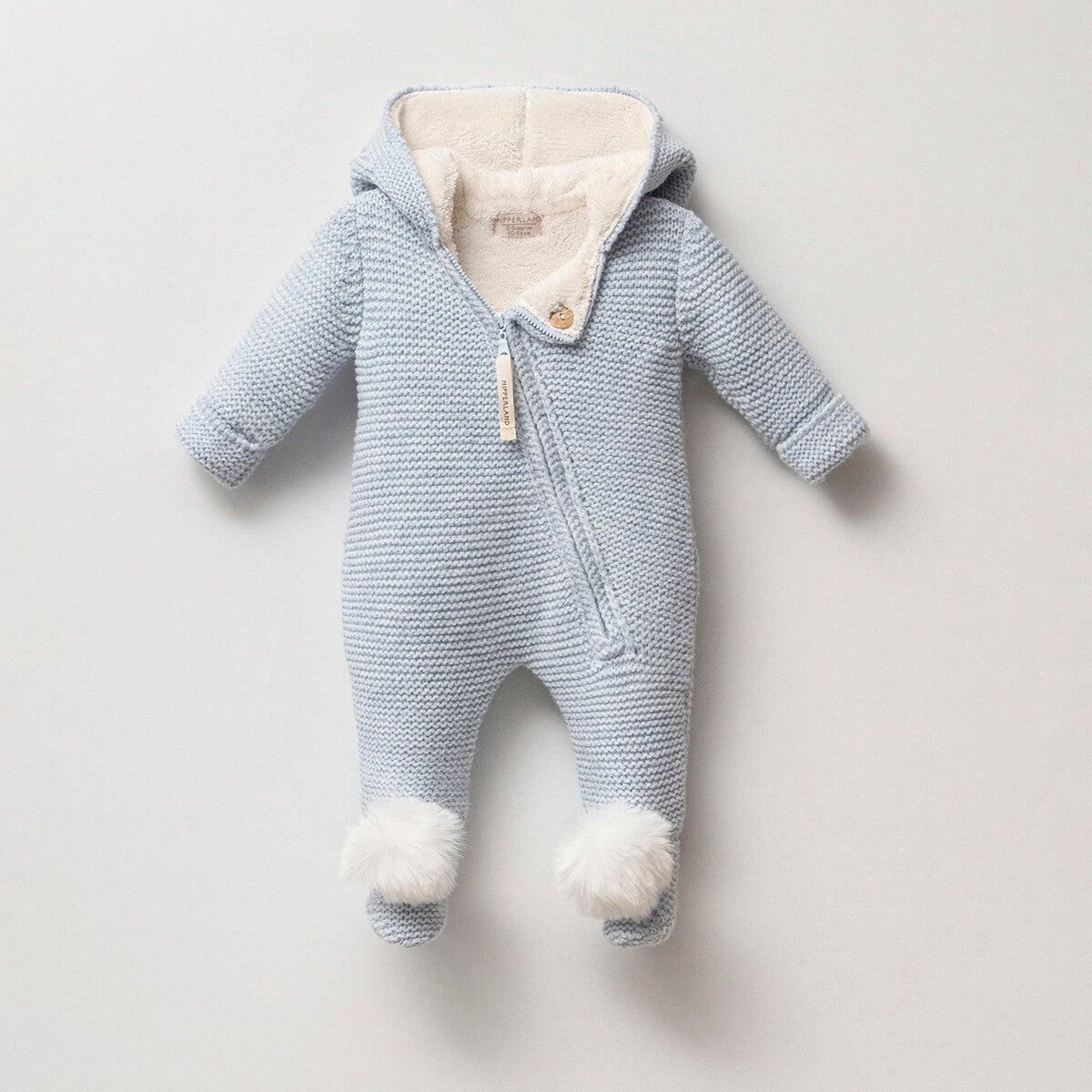 Herbst-Winter-Saison Unisex Baby Kapuzenoverall. Die Außenseite des Produkts besteht aus einer Wollmischung-Strickware, das Innenfutter aus Welsoft.