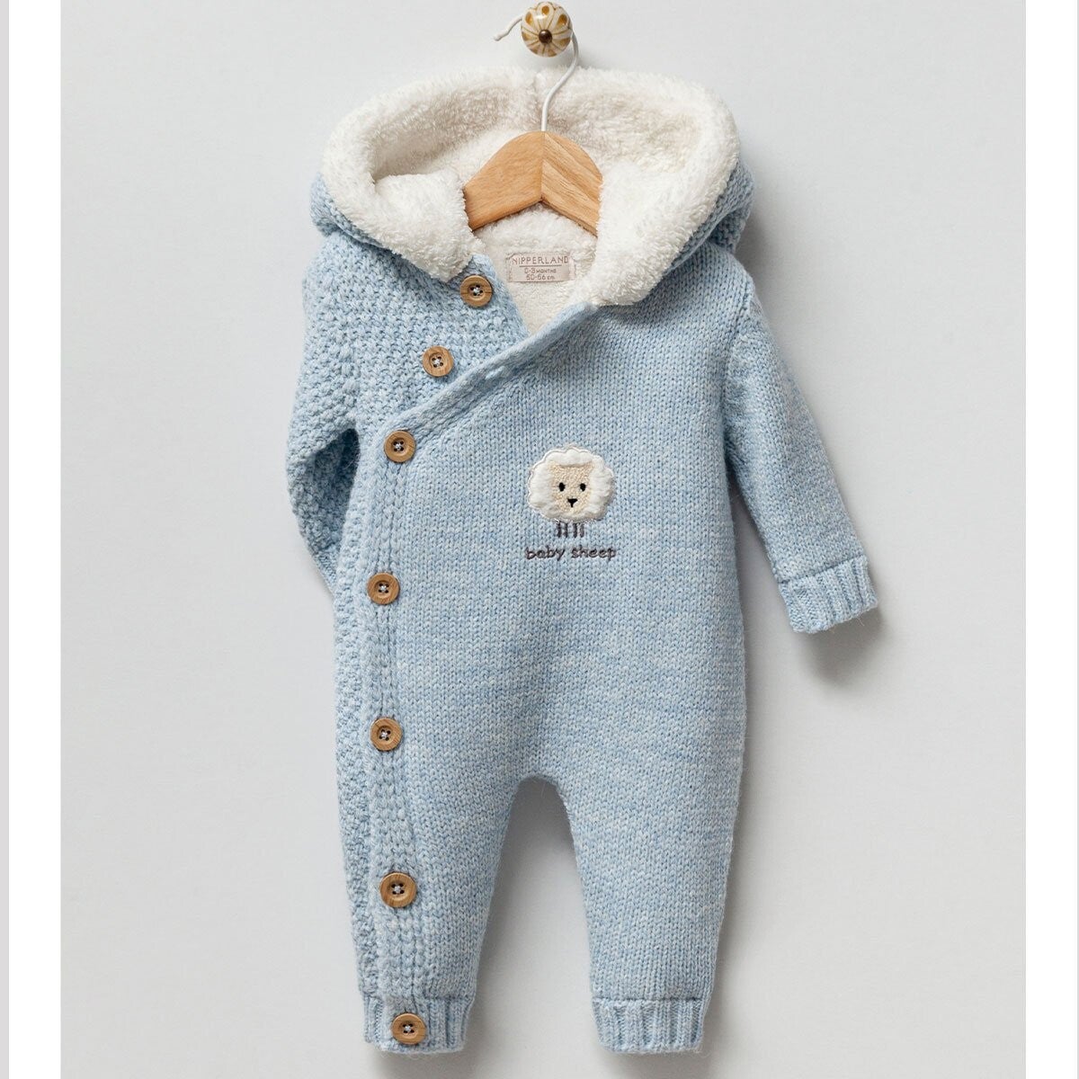 Herbst-Winter-Saison Unisex Baby Kapuzenoverall. Die Außenseite des Produkts besteht aus einer Wollmischung-Strickware, das Innenfutter aus Welsoft.