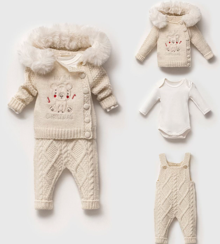 Das Set besteht aus einer kapuzenbesetzten, mit Fell gefütterten Jacke, einer bequemen Latzhose und einem superweichen Shirt, die alle aus Wollgarn gefertigt sind.